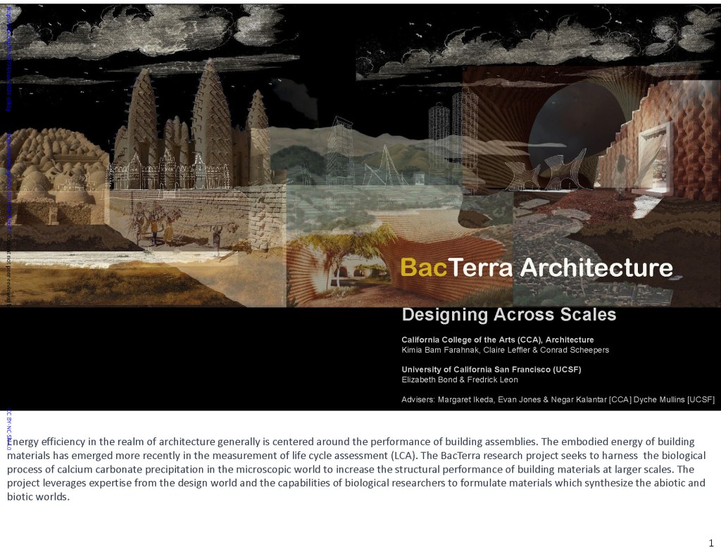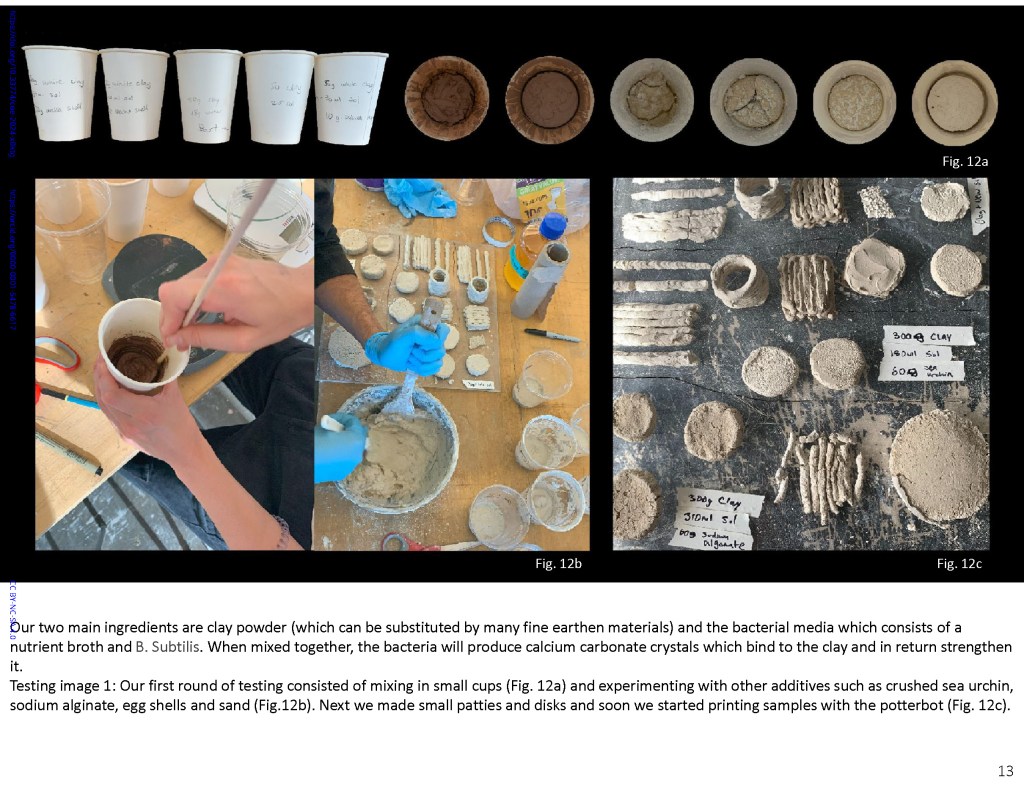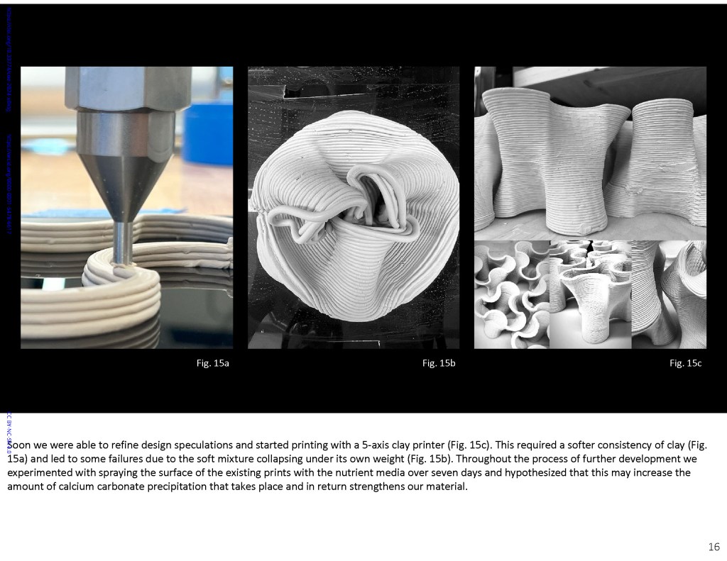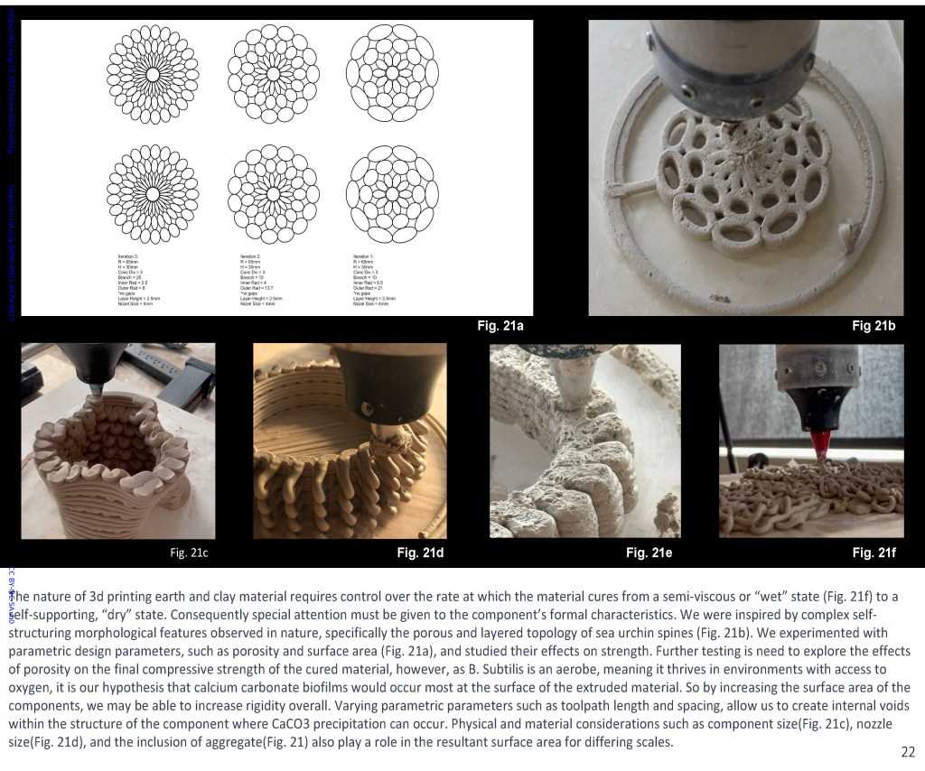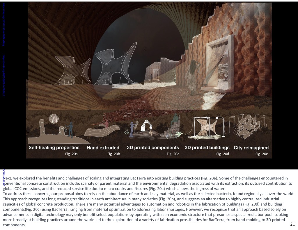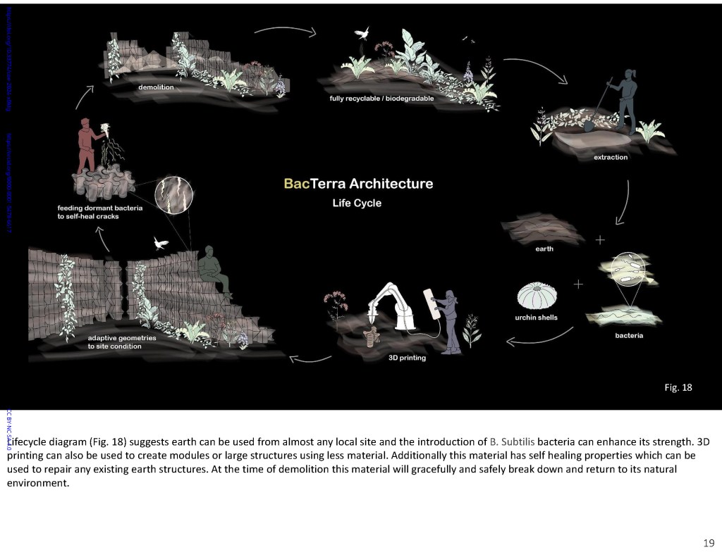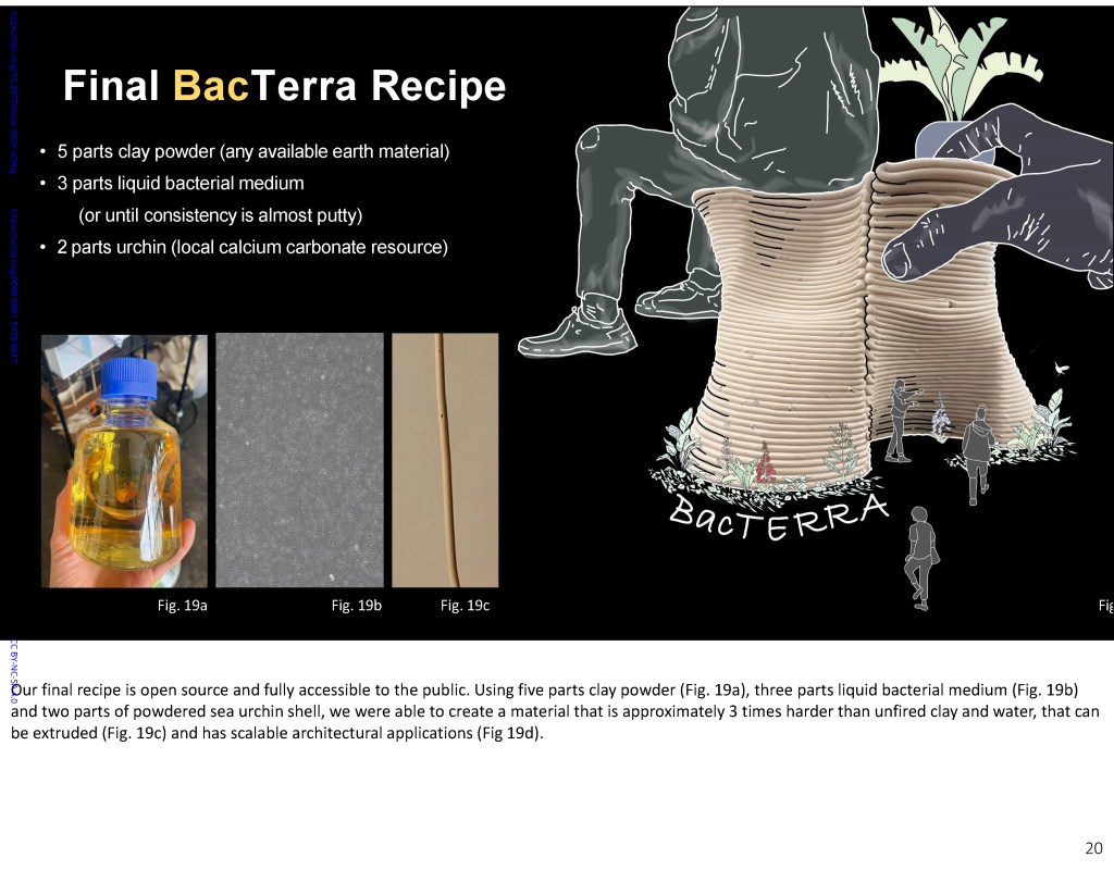 Project Description: The BacTerra project utilizes Bacillus subtilis bacteria and robotic printing techniques to transform soil into bio-composites for construction. This innovative approach creates self-healing, sustainable materials that reduce environmental impact while rethinking traditional construction practices, combining architecture, biology, and design to address global challenges in resource efficiency and sustainability. The project was recognized with the Outstanding Science Award at the Biodesign Challenge.