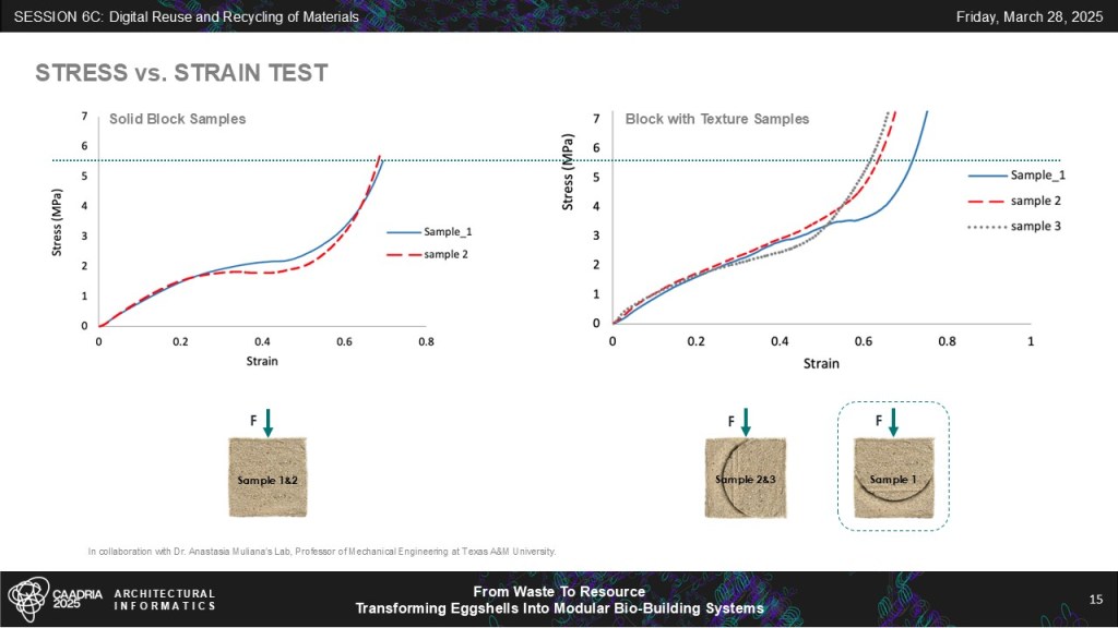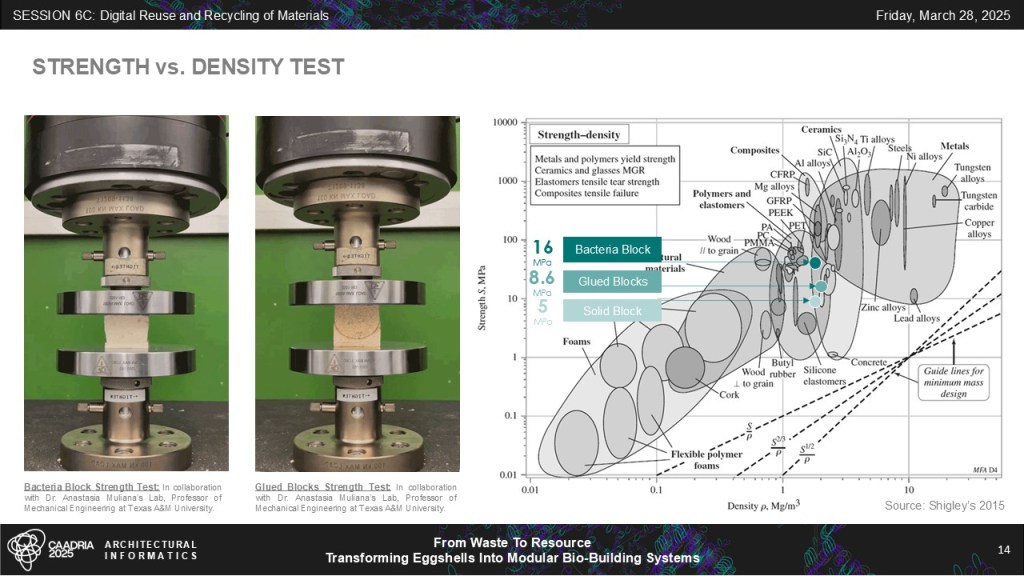Shell We Dance? transforms egg and shellfish waste into sustainable building materials, addressing construction waste and carbon emissions. Inspired by natural shell structures, the project developed moldable components and a complementary adhesive infused with living bacteria to enhance structural capacity. Mechanical testing of the material was conducted by Texas A&M’s Mechanical Engineering department, ensuring its performance and durability. The project was recognized with the Outstanding Science Award at the Biodesign Challenge.