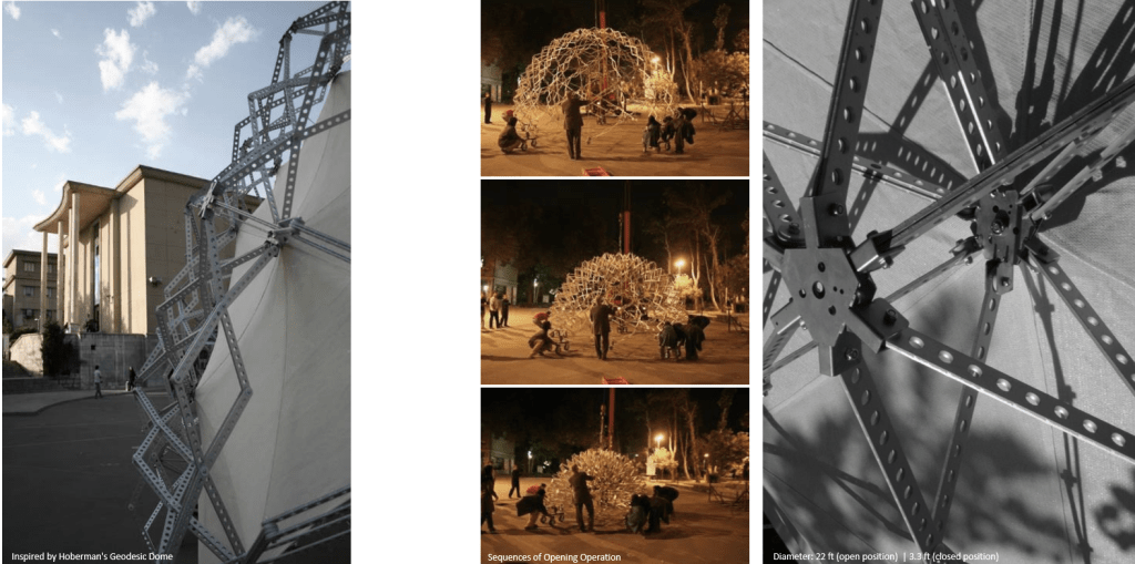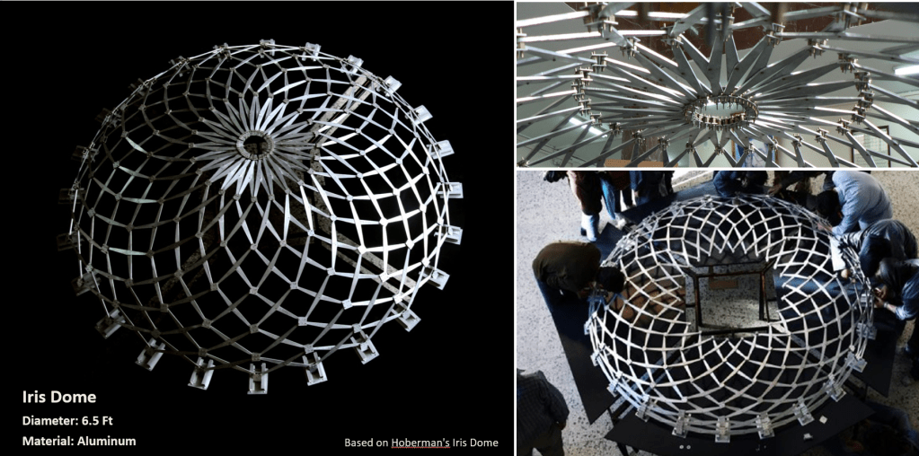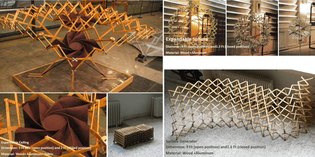 Project Description: Inspired by Hoberman’s angled scissor mechanisms in Geodesic and Iris Domes, we developed a range of transformable and portable structures at various scales. These designs include the Expandable Sphere, the Deployable Curved Surface (a Cyberspace Generator), and the Square-like Deployable Ceiling with foldable covering components. The outcomes of our exploration into geometric transformations were exhibited to showcase the beauty of motion, using repeated simple geometric elements to form complex and dynamic patterns.