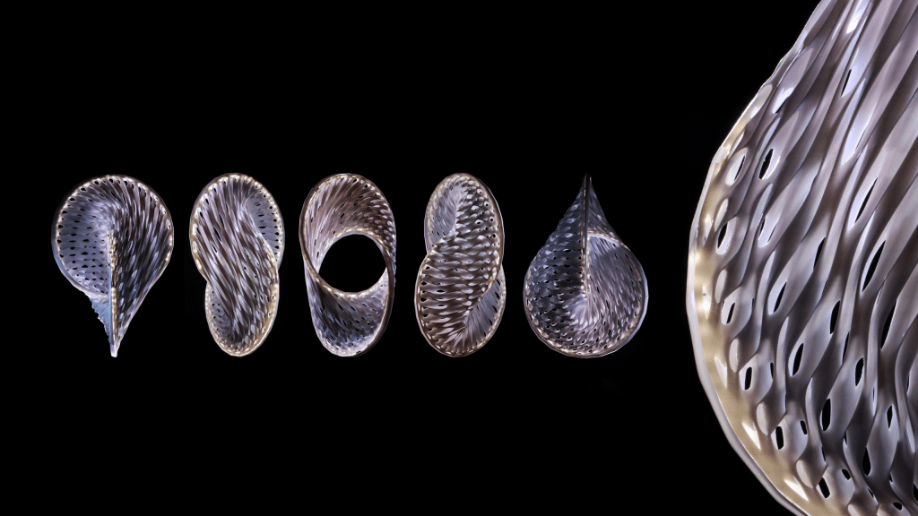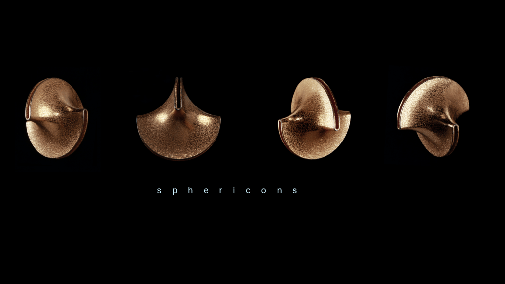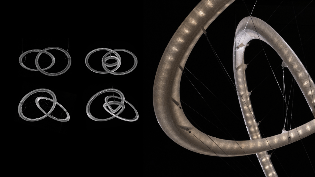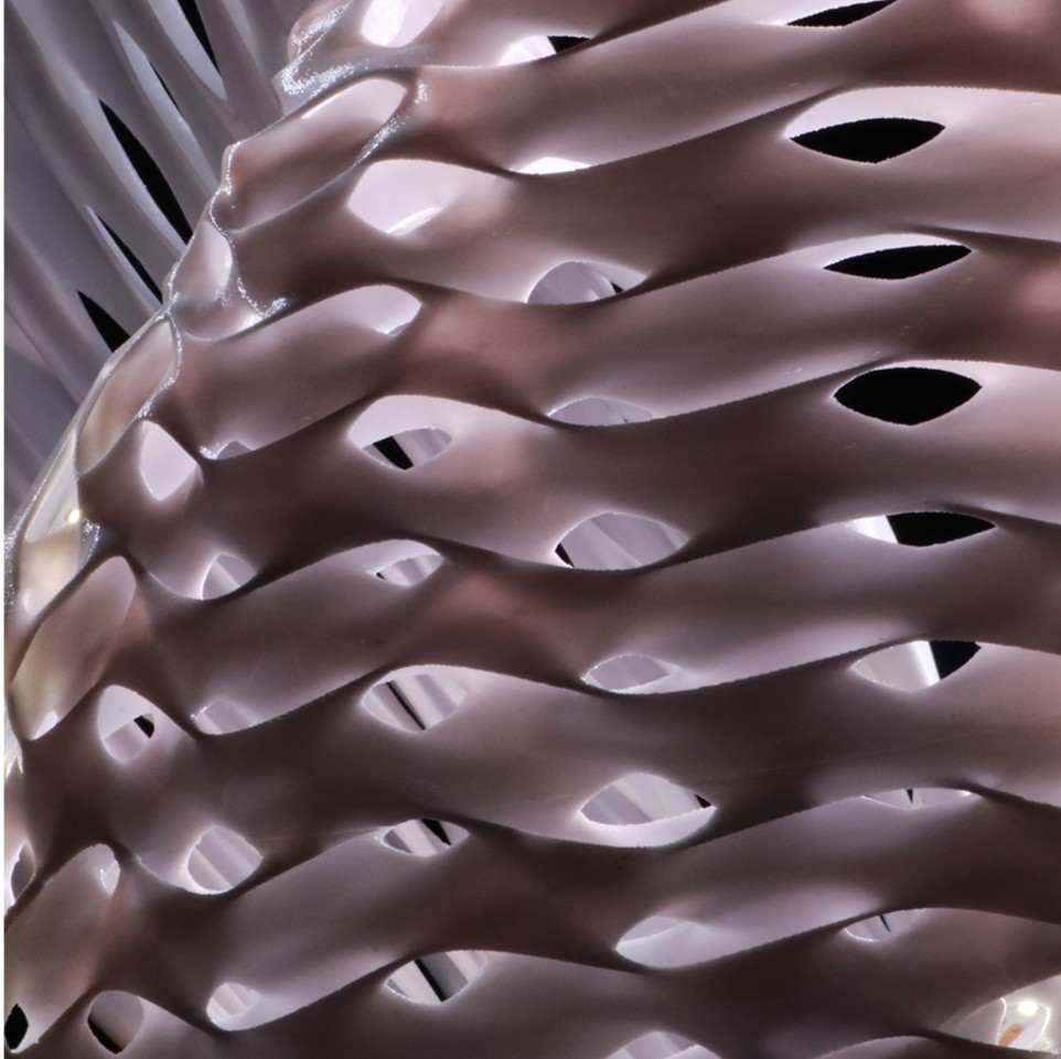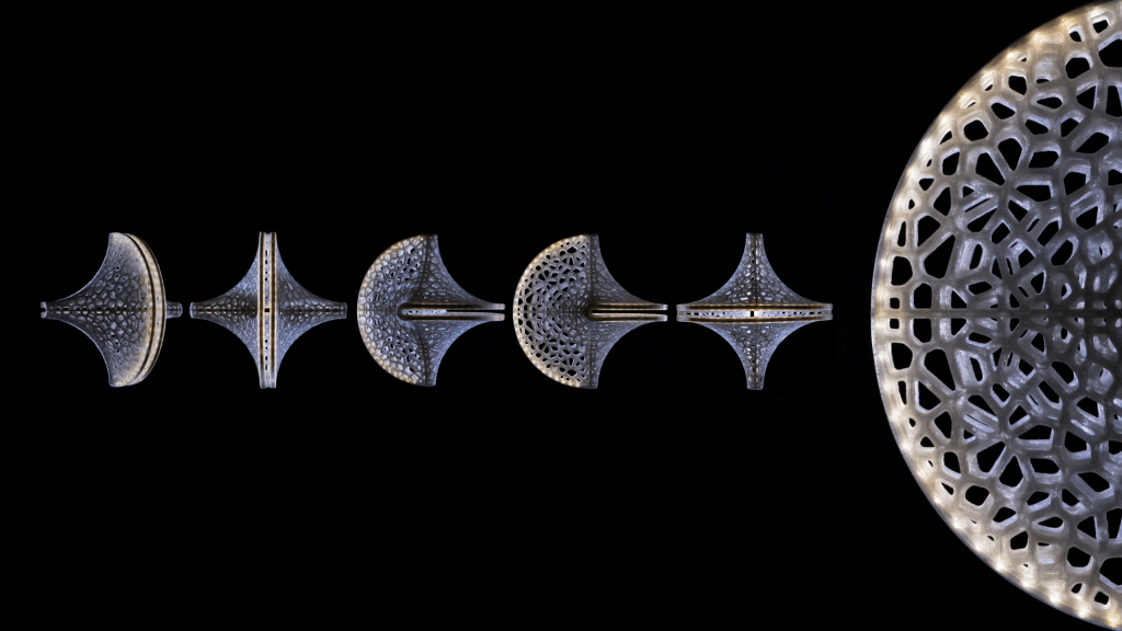 Project Description: This collection of Oloid- and Sphericon-inspired pendant lamps features custom geometric surfaces, including gyroid minimal surfaces and Voronoi tessellated cells. Backlit by hidden LED strip lights, the lamps cast intricate patterns and shadows, dynamically shifting as viewers move around them. Designed with playful functionality, each lamp can roll smoothly when unplugged, engaging users with mesmerizing motions. Through innovative fabrication techniques like tensegrity and continuous frames, the lamps offer sculptural elegance and interactive experiences that captivate audiences of all ages.