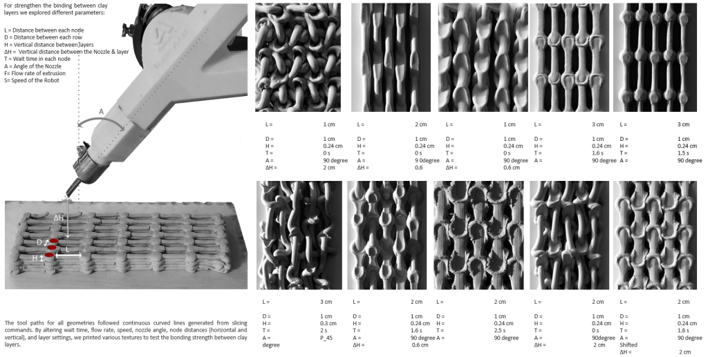 Project Description: To strengthen the binding between clay layers, we focused on three scales: Micro, Mezzo, and Macro. The core of this research was to explore how fine-tuning printing parameters at the Mezzo scale could achieve varying structural strengths and surface patterns. By adjusting flow rate, speed, waiting time, and layer spacing, we were able to create different strengths and textures. To maintain consistent and controllable flow rates, we designed and tested various augers to optimize printing quality.