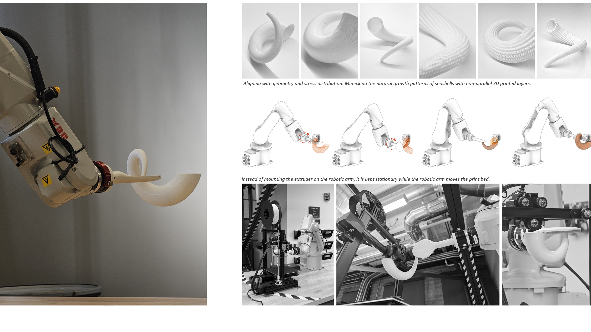Project Description: Inspired by the natural layering processes of mollusks, “Parametric Biomimicry” reimagines the geometry of spiral seashells, transforming these organic forms into complex 3D models and leveraging the potential of robotic 3D printing. To fabricate the shell, the setup keeps the extruder stationary while the robotic arm moves the print bed, enabling precise material deposition. This configuration eliminates collision risks between the fixed extruder and the moving robotic arm, allowing for scaffold-free printing of complex spiral geometries. The process demonstrates the potential for faster, more efficient production through continuous material deposition without support structures.