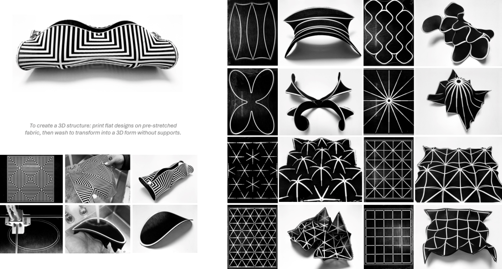 Project Description: This project focused on designing a 3D textile structure from a two-dimensional pattern. We 3D printed flat patterns onto pre-stretched fabric, allowing it to transform into a volume without any support structures. When released from tension and washed, the fabric contracted back to its natural state, but the printed pattern resisted this shrinkage. As a result, the pattern interacted with the fabric’s contraction, creating stable, dynamic shapes. The fabric’s elasticity, the stiffness of the printed pattern, and the gaps between printed segments caused varying degrees of shrinkage, resulting in unique 3D volumes as the fabric squeezed and the pattern popped out.